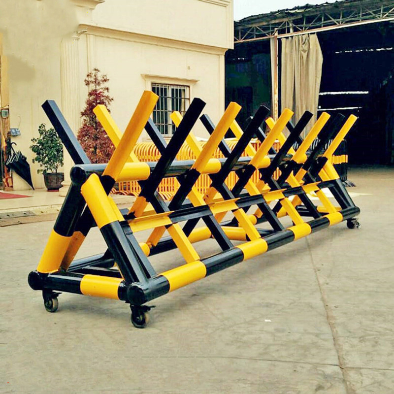 固定安装:按设计间距弹线,电锤钻Φ14mm孔深10cm,植入M12膨胀螺栓,底板孔位对准后放入弹簧垫圈,用扭矩扳手拧紧至45N·m。临时布防:推至预定位置后依次踩下各万向轮刹车,并在两端压放配重沙袋(每端不少于35kg)。多组串联时,用镀锌链条穿过两端连接环并配合花篮螺栓张紧。撤收时先拆除链条,再解锁刹车逐组移开。