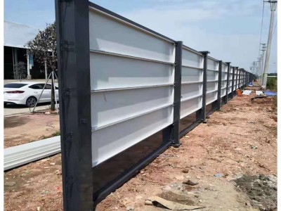 按图放线,每2.8米定立柱中心,地面平整夯实。立柱基础用C25细石混凝土浇筑400×400×300mm独立墩,预埋4根M12地脚螺栓;硬化地面改用M12膨胀螺栓固定。立柱就位后激光水平仪双向校垂,误差≤2mm。从一端将围挡板吊入立柱卡槽,每块板上下各用2颗螺栓加弹簧垫圈锁紧横梁。转角用专用阳角柱,缝隙耐候胶密封。迎风面每隔5米设斜撑(40×40方钢,与地面夹角50°),底端埋混凝土墩或接地锚。顶梁通长粘贴红白反光膜,每转角及每10米挂安全牌。