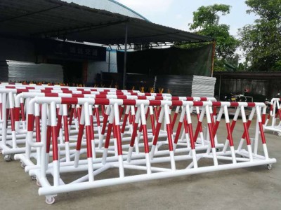 移动反光护栏每组底部配有4寸聚氨酯万向轮,带双刹车,推行轻便且停放稳定。护栏可折叠,折叠后厚度仅18cm,便于堆码和货车装载。表面静电喷塑,涂层经300小时盐雾试验无锈蚀,适合户外长期使用。本厂同时生产推拉防撞栏杆、挡车拒马护栏及铁马防护栏,均可来图定制。